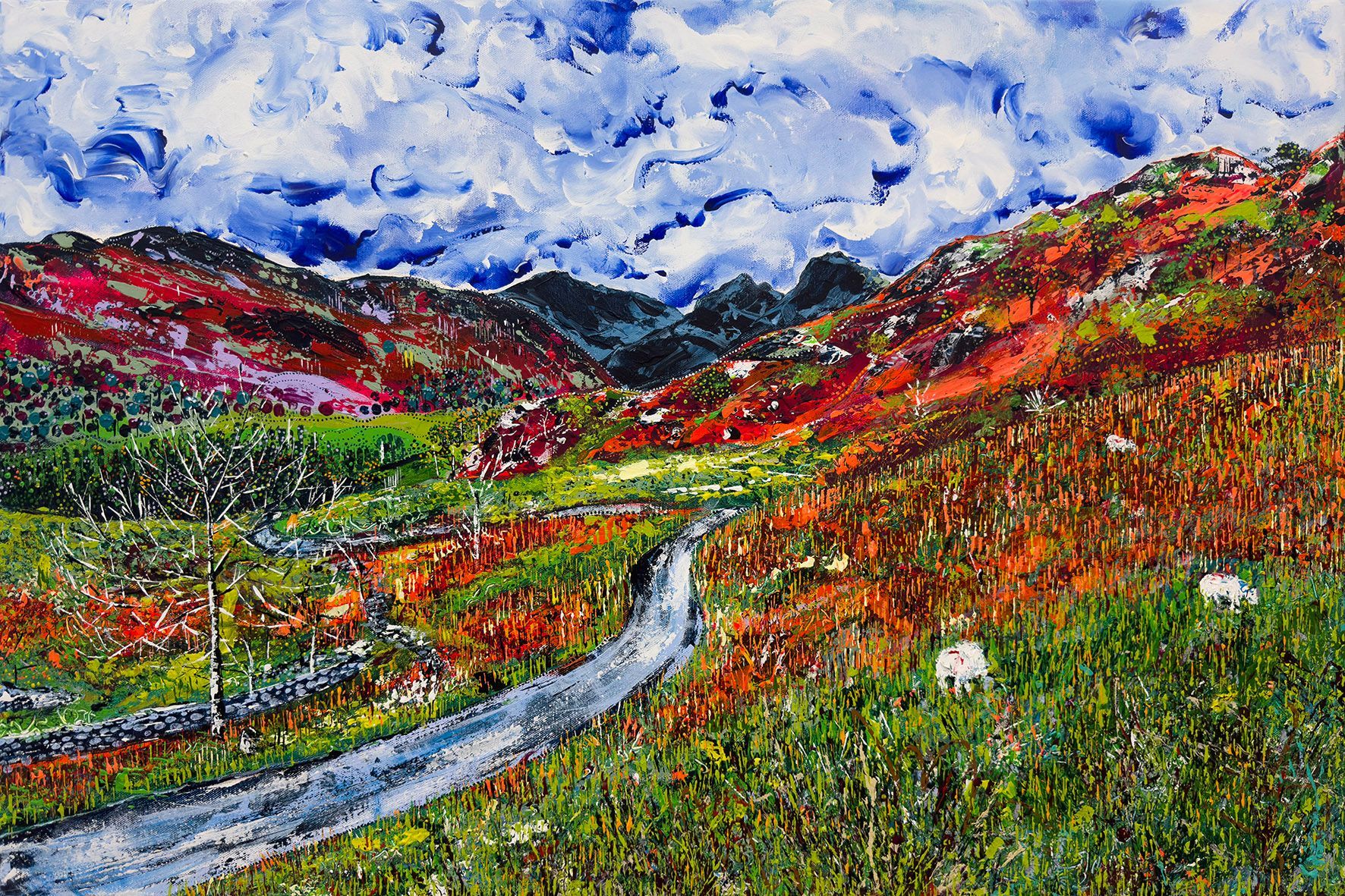 My painting tools include pallet knifes, which I favour for the way they apply paint to canvas, creating textures and a raw imperfection which feels natural and real in connecting with nature. I also paint with my fingers, particularly in the clouds, feeling within them. Clouds have a sense of freedom and movement, which I feel is expressed better with my hands and fingers in the paint. The dot detail is drawn from my inspiration of Aboriginal art and how we as people are connected to the land, we are all part of our beautiful earth, we are one.