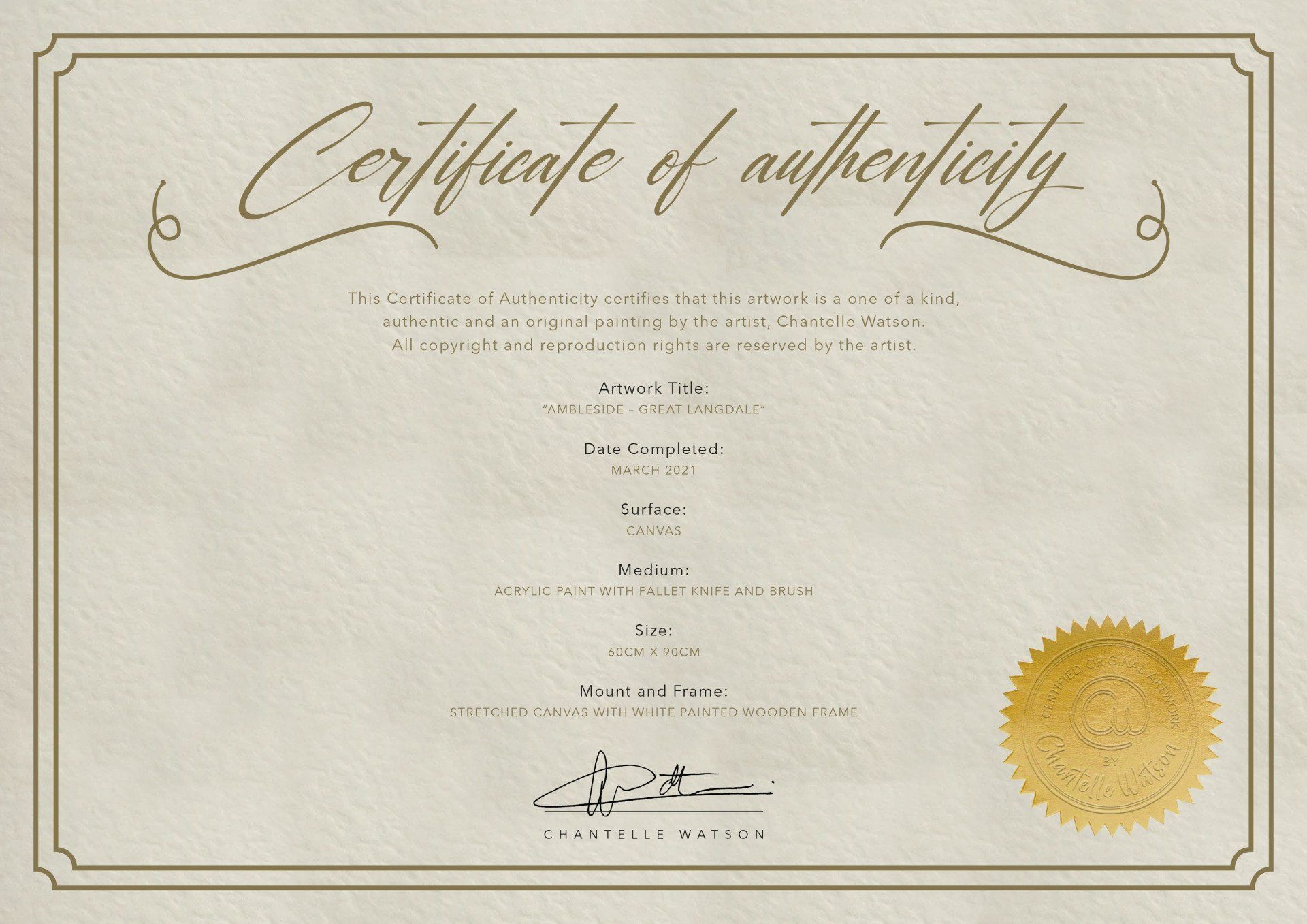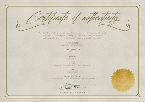 Every painting comes with a Certificate of Authenticity including details about the artwork and on the reverse there is a story behind the essence of the painting and what makes it so unique.